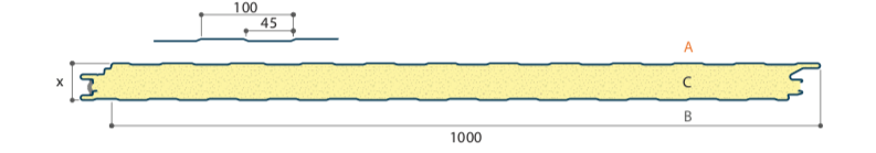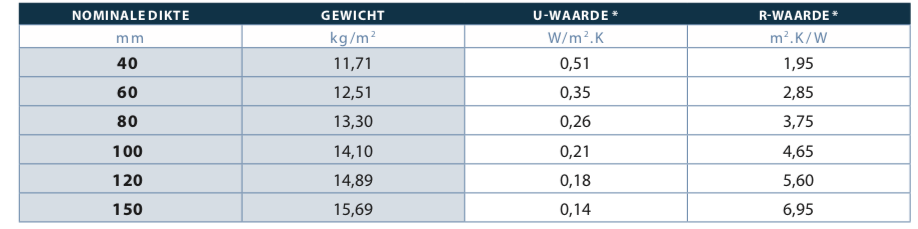 De panelen zijn verkrijgbaar in de volgende diktes (mm) met PIR isolatie: