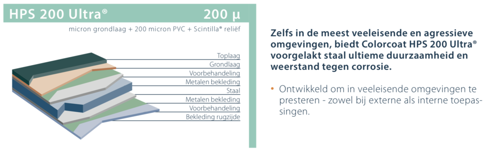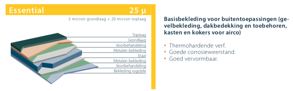 Stalen plaat van 0,6 mm dik, gelinieerd. Type metaal: S 320 GD. Verkrijgbaar in meer dan 30 kleuren.